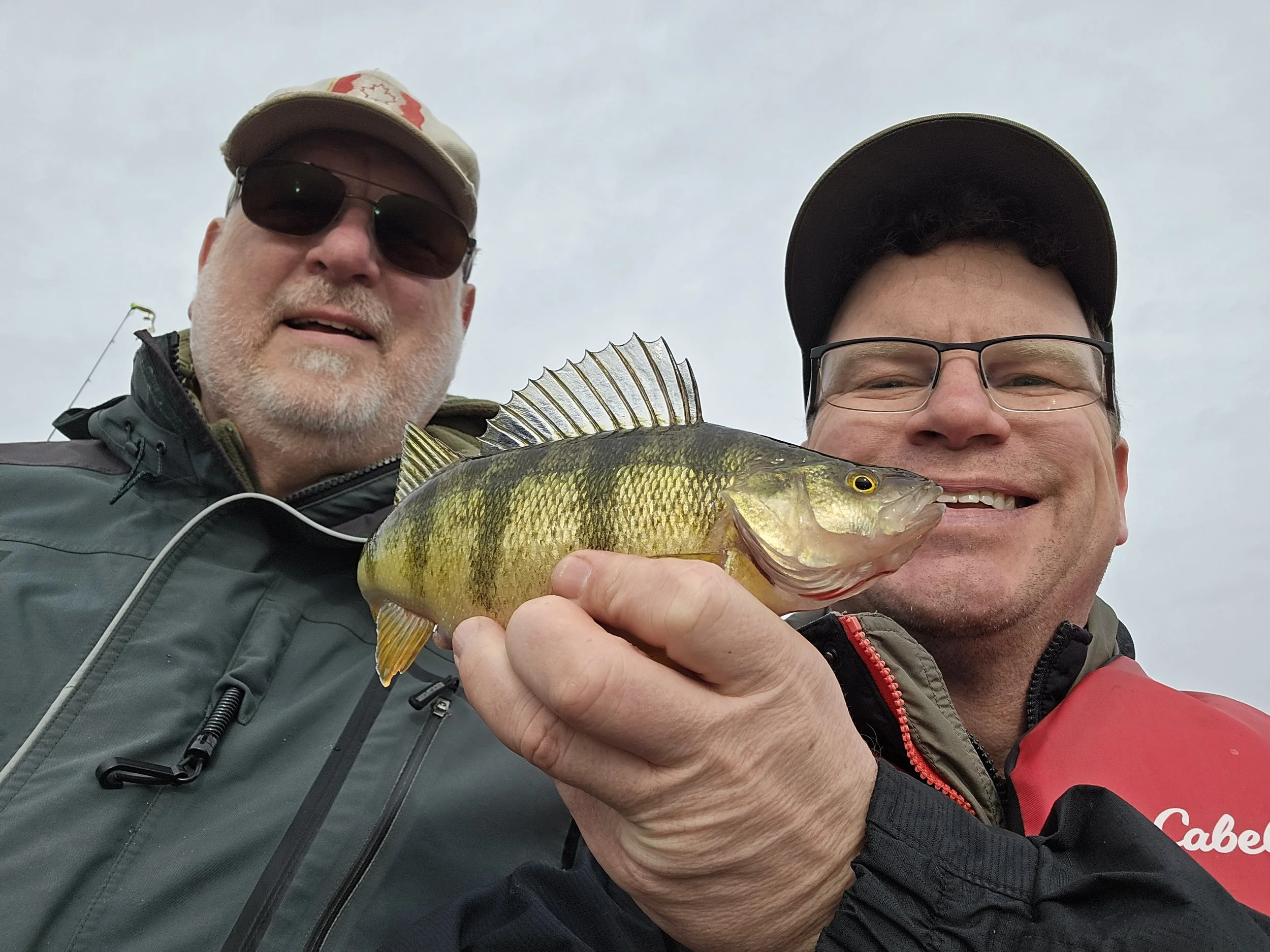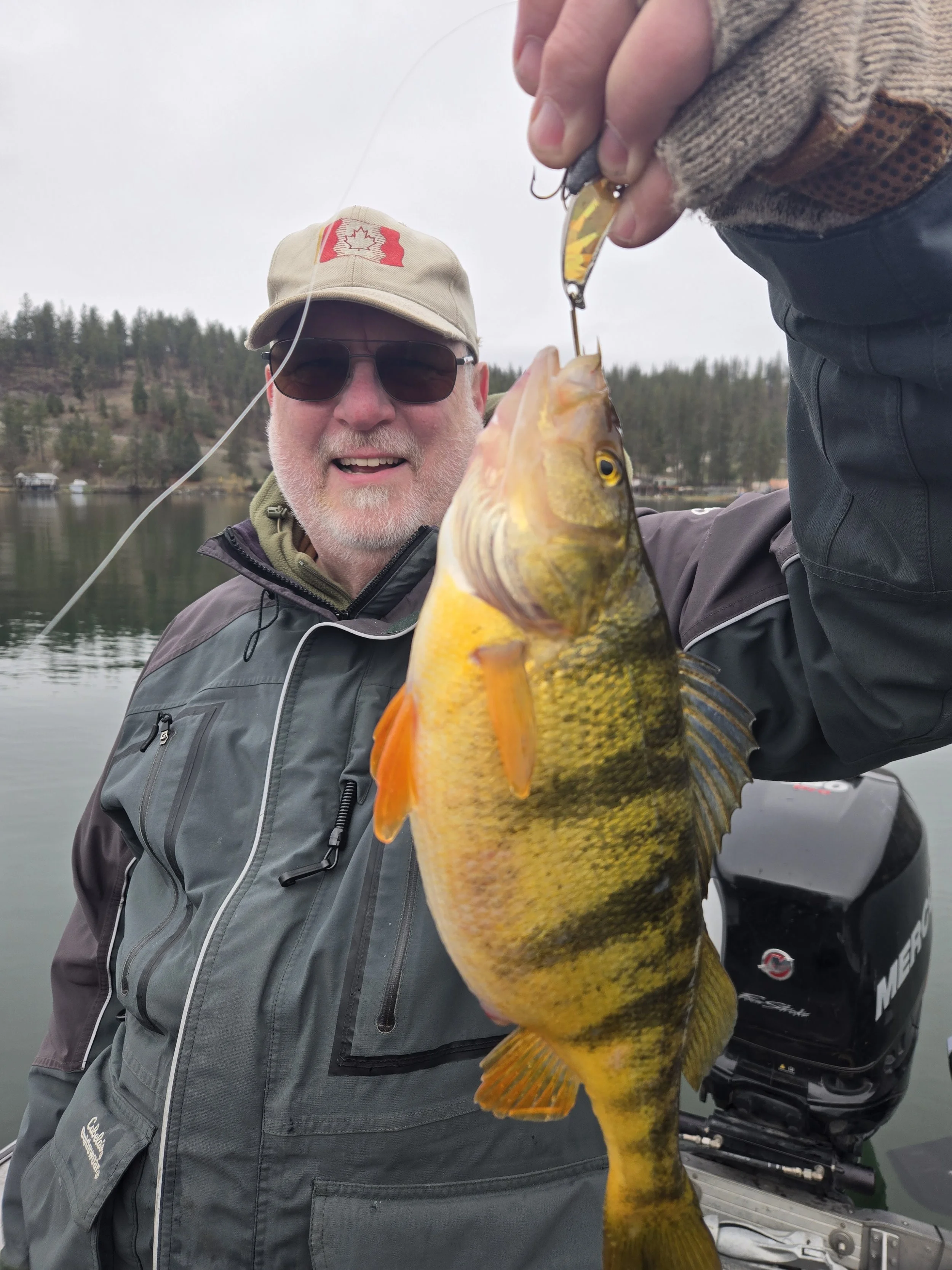 Allan and I made plans months ago to be at Curlew Lake to ice fish near the beginning of February. We cancelled that trip due to the warm winter. We needed to get our perch fix elsewhere, so we decided to give Lake Spokane a try. We have caught lots of perch there in the fall, so why not give it a try? I picked up some maggots and crawlers to see what would happen with my ice rod out of Allan’s boat. We caught and released a couple walleyes (17 and 21 inches) and 3 smallmouth bass while we searched mid-lake humps, flats, and channel breaks. Once we marked the unmistakable pile of perch on sonar, we hit anchor lock. We stopped counting after we had 12 perch in about 10 minutes. Between the two of us, we caught a perch every couple of minutes for 3 hours. The 2 biggest were between 13 and 14 inches. The average was 10 or 11 inches. We released all the fish we caught.